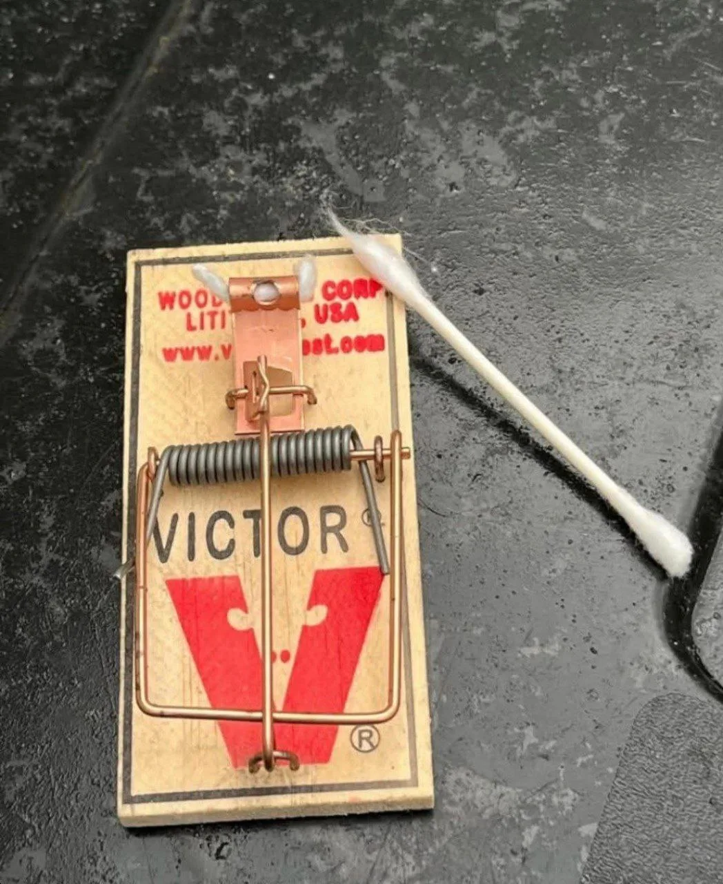 Trap Baits Cheese, peanut butter, and artificial baits will work. I recently learned that Cotton is a great bait. Mice will be attracted to nesting materials. The hollow end of a mouse trap trigger is designed to place cotton inside. Use a Q-tip to load the cotton spot. It just takes a little.